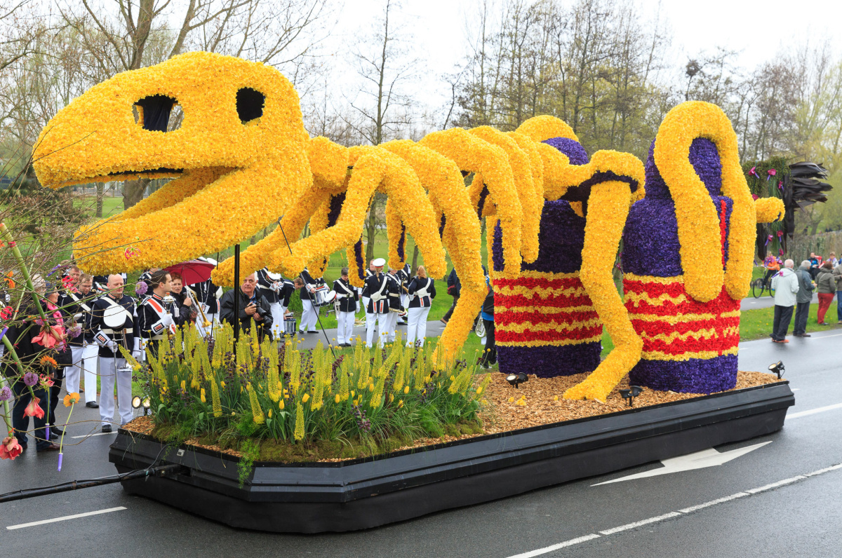 Mezi pestrobarevnými alegorickými vozy najdete známé pohádkové postavičky, ale i ohromné papoušky v pralese, pestrobarevný kolotoč, květinovou loď, flašinet nebo vodní skútr. Všechna aranžmá jsou vytvořena hlavně z květů tulipánů, hyacintů a narcisů, a především díky hyacintům silně a opojně voní.